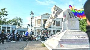 Manifestantes derriban estatua de Colón en Colombia