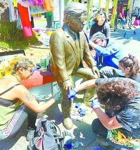 Profesoras y alumnos de Escuela de Oficios Patrimoniales limpian estatua del cantante Jorge Farías